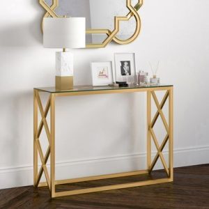 Entrance table made in mild steel in gold deco with glass top. 42 inches length, 30 inches height and 12 inches depth.